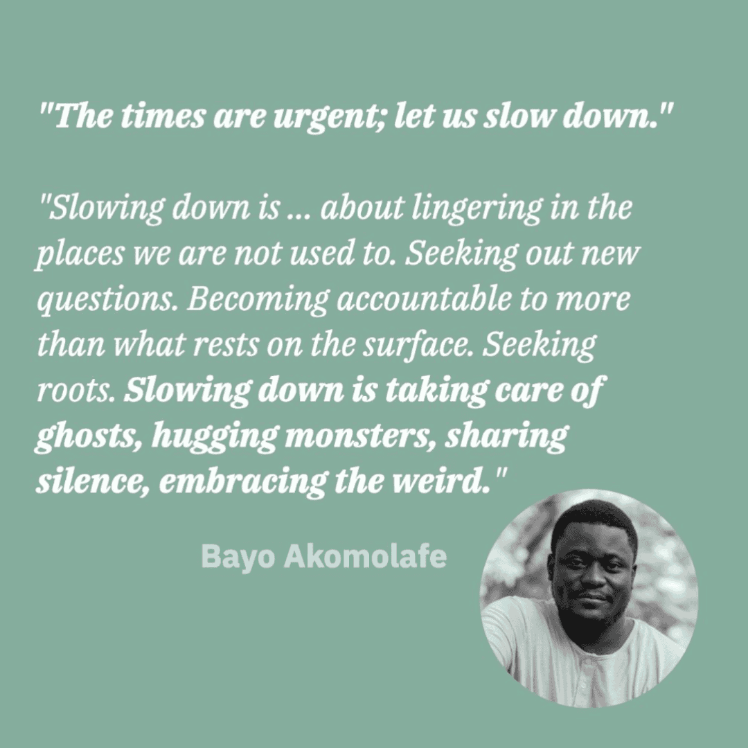 Snelle actie voelt als de juiste reactie in crisistijden. Maar A slower urgency pleit juist voor vertraging. Niet uitstel, maar een bewuste pauze om รฉcht te begrijpen wat nodig is. De schrijver isย Bรกyรฒ Akรณmolรกfรฉ:ย filosoof, schrijver, dichter, docent en internationaal spreker.