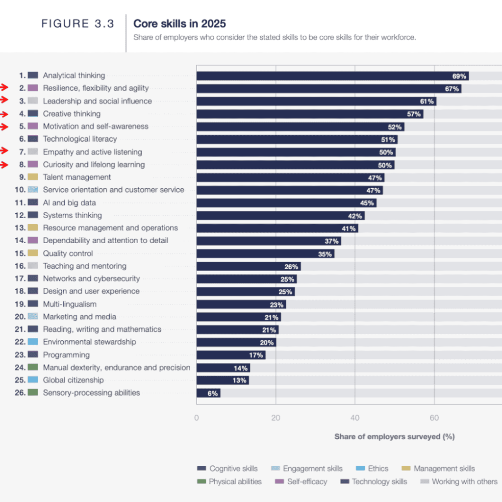 Veerkracht, samenwerking, creativiteit, zelfbewustzijn – de รฉchte gamechangers staan direct onder analytisch denken in de top 5. De toekomst vraagt om een combinatie van scherpe analyse รฉn sociale vaardigheden en persoonlijke groei. Probleemoplossers die niet alleen denken, maar ook voelen, verbinden en vernieuwen.