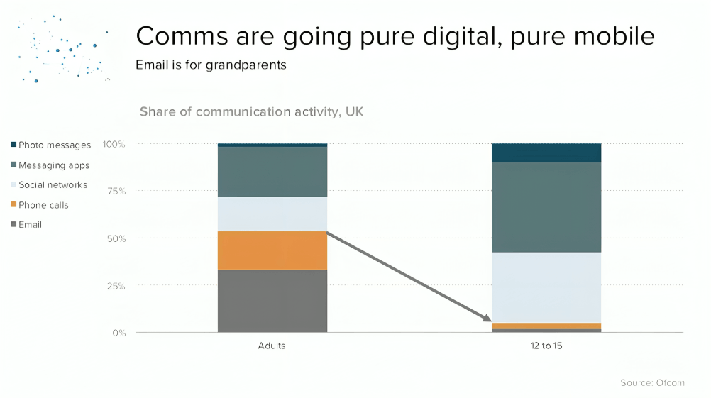 Door het zien van dit plaatje, begreep ik hun beter. Tuurlijk, ze zitten nog niet op de arbeidsmarkt, de wereld van e-mail. Maar ongetwijfeld geven ze de voorkeur aan slack-achtige omgevingen. Chatten in Teams of Notion. En dat sluit weer beter aan bij samenwerken in projectteams of netwerken.ย