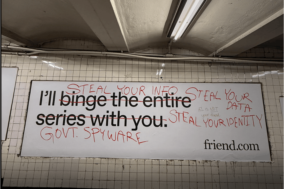 Een reclamecampagne voor een AI-metgezel heeft New York City overspoeld, gesprekken op gang gebracht en vandalisme geรฏnspireerd. Het gaat over een draagbare AI-hanger, die voor 129 dollar naar je gesprekken luistert en je vriend wordt. Het wakkerde een maatschappelijke discussie aan over technologie, eenzaamheid en menselijke relaties. Er werd een website gemaakt als online museum van alle beschadigde, bekladde posters.
