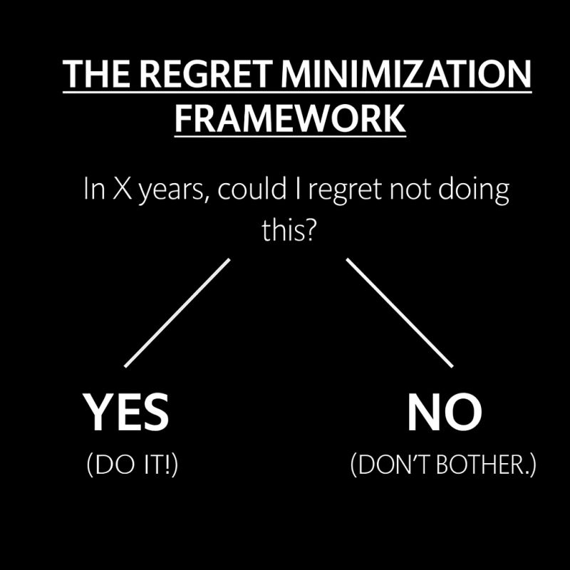 Stel je voor dat je tachtig bent. Zou je spijt hebben als je deze kans nu niet grijpt? De regret minimization framework is simpel. Jeff Bezos gebruikte dit idee vรณรณr hij Amazon begon. En we weten hoe dat afliep. De tweede vraag die je jezelf vervolgens stelt is: โ€œAls ik faal, zou ik dan spijt hebben dat ik dat gedaan heb?โ€