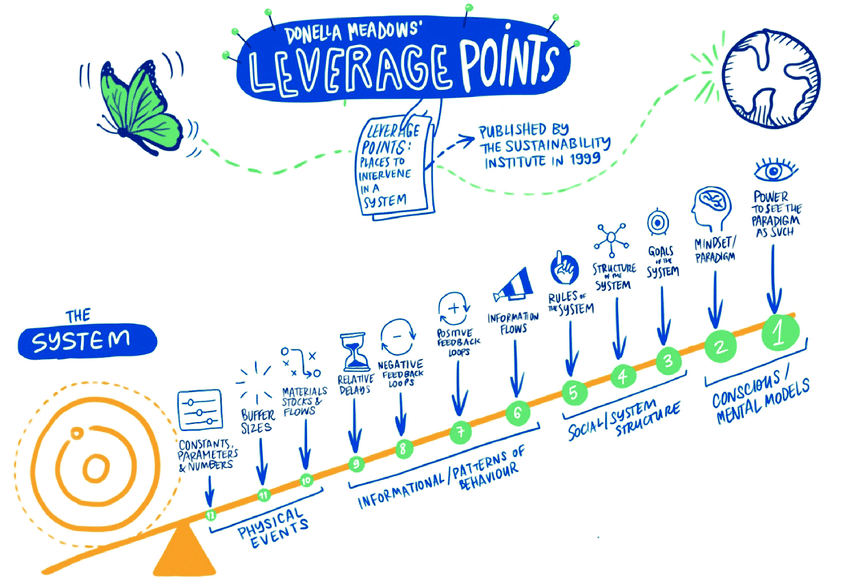 Wat het boek krachtig maakt, is hoe het werk van Donella Meadows wordt toegepast. Meadows beschreef twaalf plekken waar je in een systeem kunt ingrijpen. Dat is een fijne basis om systemen beter te begrijpen. We besteden vaak 95% van onze energie aan ingrepen die maar 5% veranderen. Denk aan kleine optimalisaties, parameters. Echte verandering zit dieper en vraagt om het verschuiven van doelen, regels of overtuigingen.